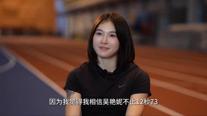 吴艳妮:“国际比赛的话,其实我本人是比较更放松的一种状态去比赛的,对。但是其实要说紧张还是会有的,因为毕竟想要跑的更好嘛,对吧,因为我觉得突破自己是最难的一件事情,对,还是会紧张的。激励,动力,没有压力,对,因为我觉得我相信吴艳妮不止12秒73。”
